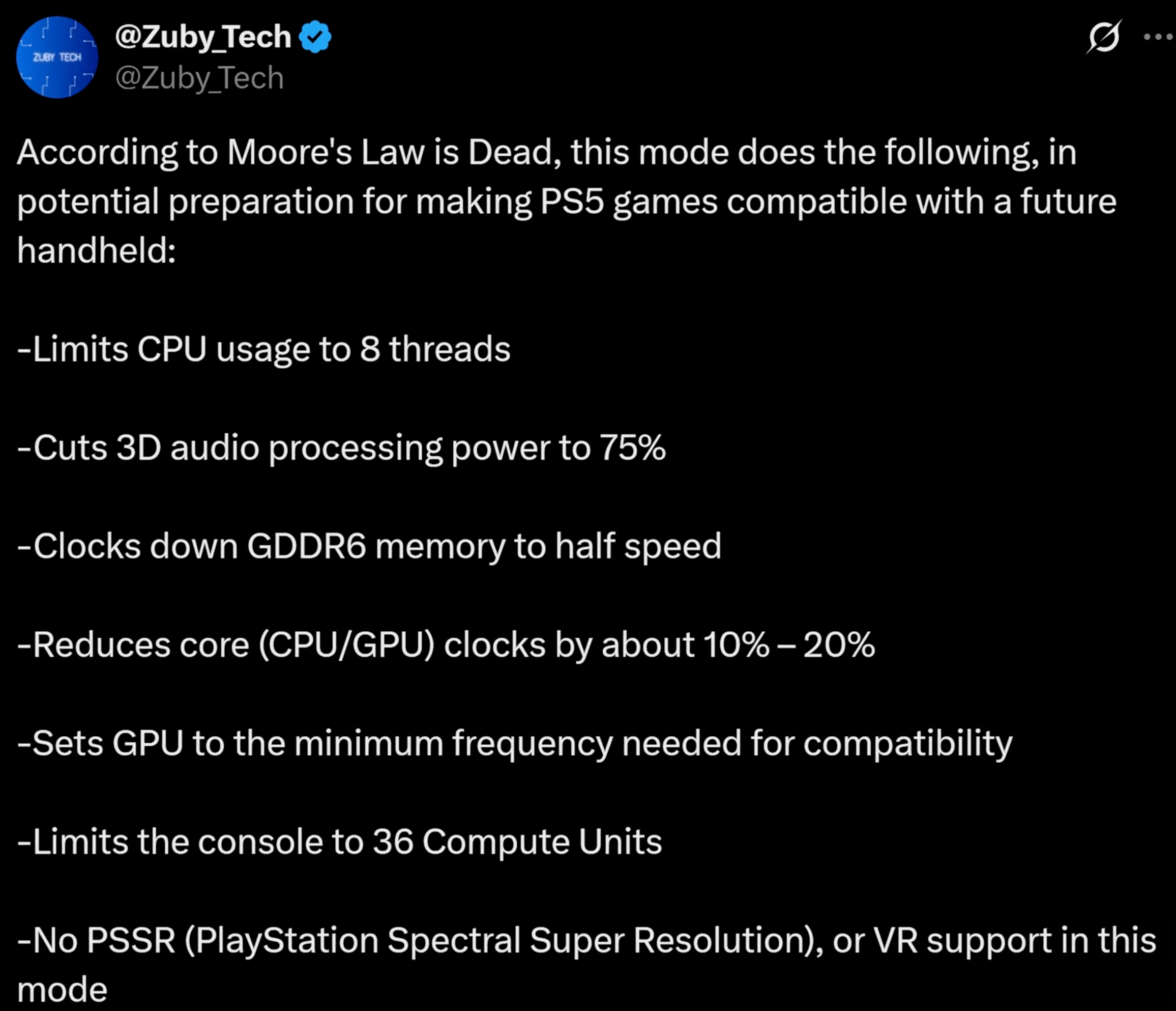So remember that "energy saver" mode for PS5 that Sony shipped? Finally, we have some more info on it courtesy of Digital Foundry. They seem to think that its existence stems primarily from a compatibility mode related to a forthcoming PlayStation handheld. Huh. Some of the details from the video and the kind of specific hardware limits involved were being shared online, and I've put a screenshot below.