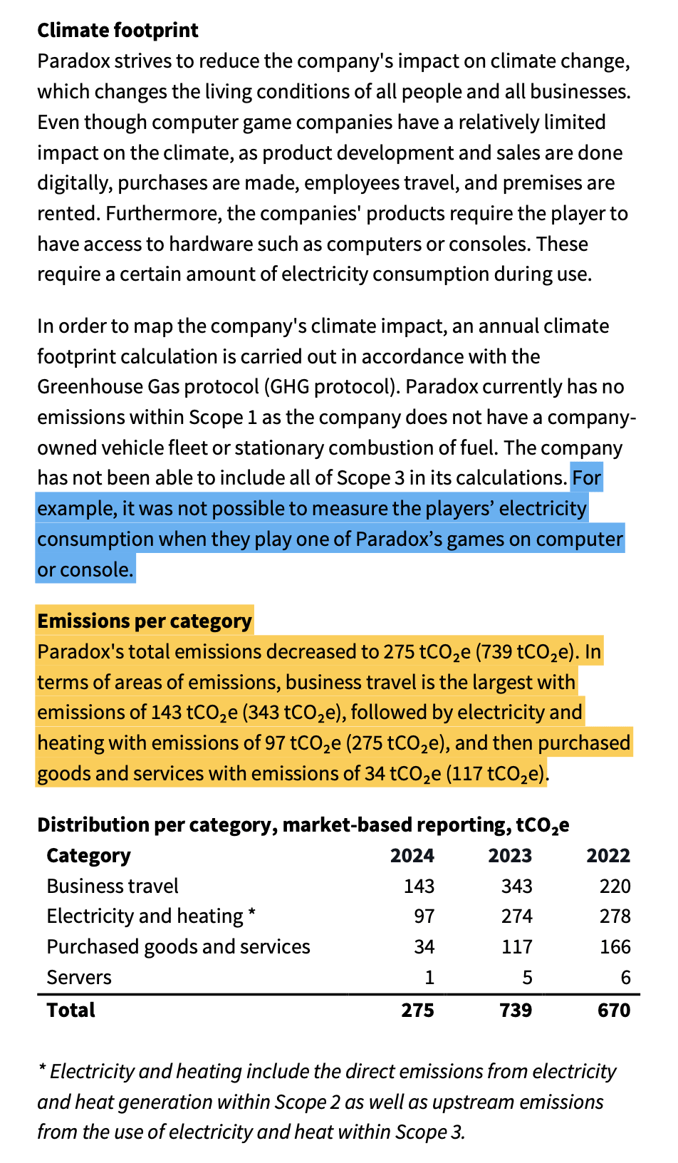 We don't often get the chance to feature too many small-to-mid size game companies on GTG – for one, because they don't tend to have the same reporting requirements and expectations as larger ones. But also, it's hard for smaller (though paradox isn't that small) games businesses to know how to measure and disclose emissions – as evidenced by the comment highlighted below!