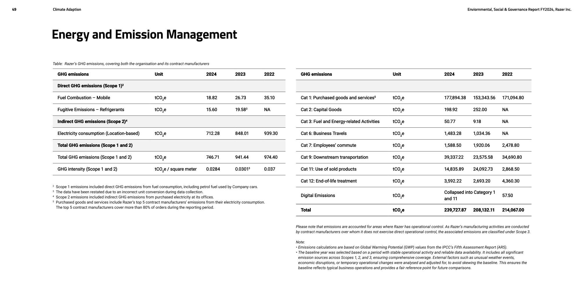 And not only that, they do some pretty detailed breakdowns of their corporate emissions footprint (including Cat.11 Use of sold products – so if you've been using a Razer mouse, keyboard or other device then your emissions have been (probably) estimated and disclosed. Neat.