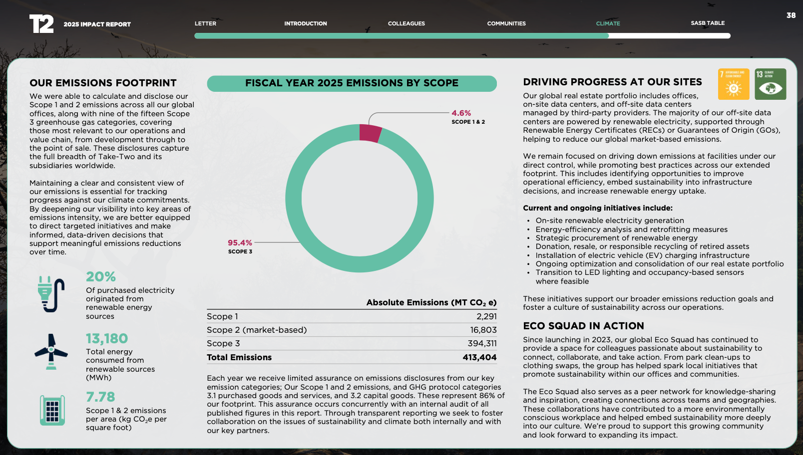 Take2’s impact report is out – and their absolute emissions are down by almost 20%, which is a substantial dip. And just as a bit of pre-clarification: I'm calling this report "about" 2024, even though it's technically FY2025 which covers April 1, 2024 to March 31, 2025. This is just one of the many, many complexities to iron out to make fair comparisons between companies, and there are so many different periods that corporate reporting can cover around the world. For simplicity I treat the year that has the most quarters in it as the "main" year its reporting on.