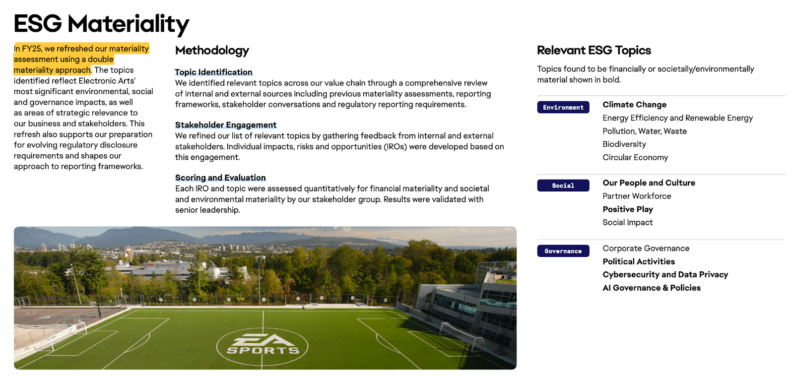 What else is in the report? Well, the environment section is a mere four pages, so not a massive amount, but EA have done a "double materiality" assessment. Though it doesn't seem to quite meet the detail required by European ESRS double materiality standards – it's still better than nothing.