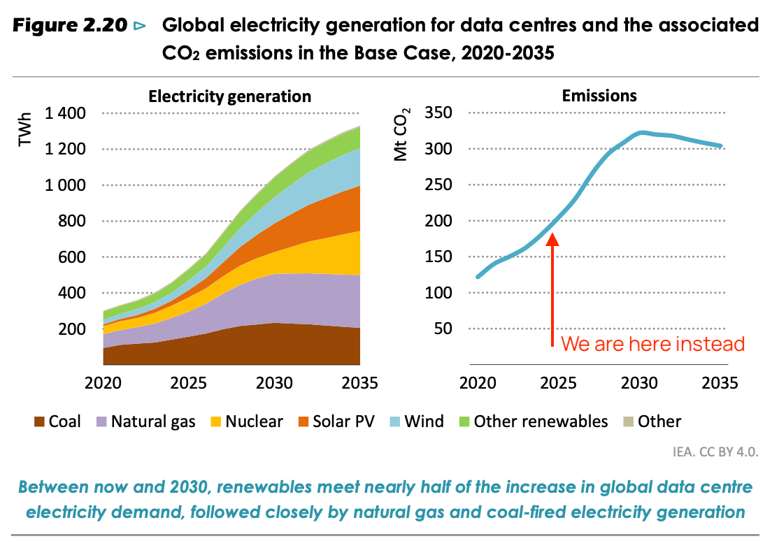 By this point, the entire ICT sector should be down about 20% give or take. I couldn’t find a “whole ICT sector emissions” graph to match see where we are today, but we can at least see how well the data centre part of the sector is going, by comparing it with the IEA’s recent report on Energy and AI.