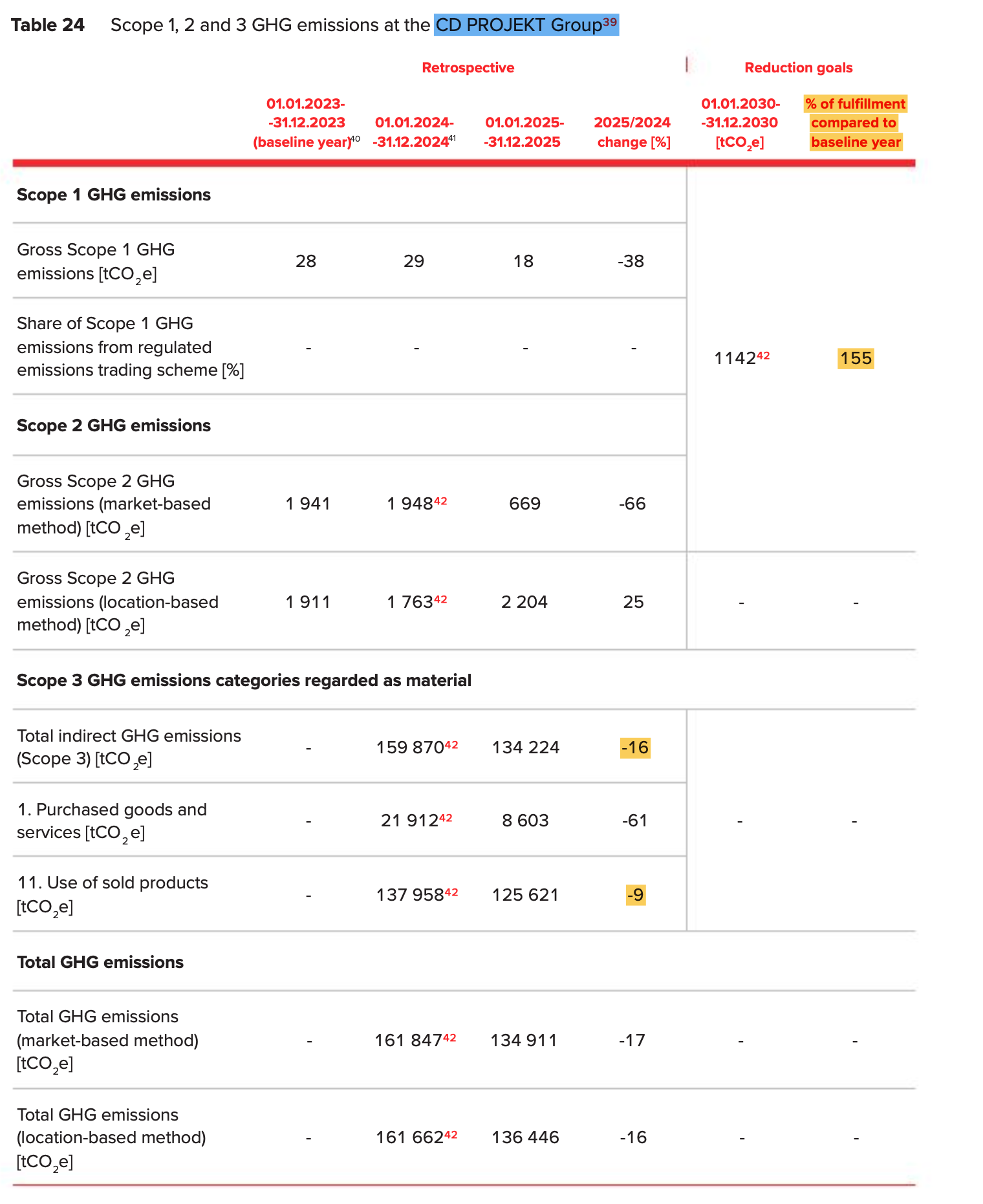 Here's the all important table of absolute GHG emissions totals – please excuse my highlighting – but if I'm reading it right, this seems like the past year has seen the CDPR Group achieve 155% of their original 2030 goals, five years early??