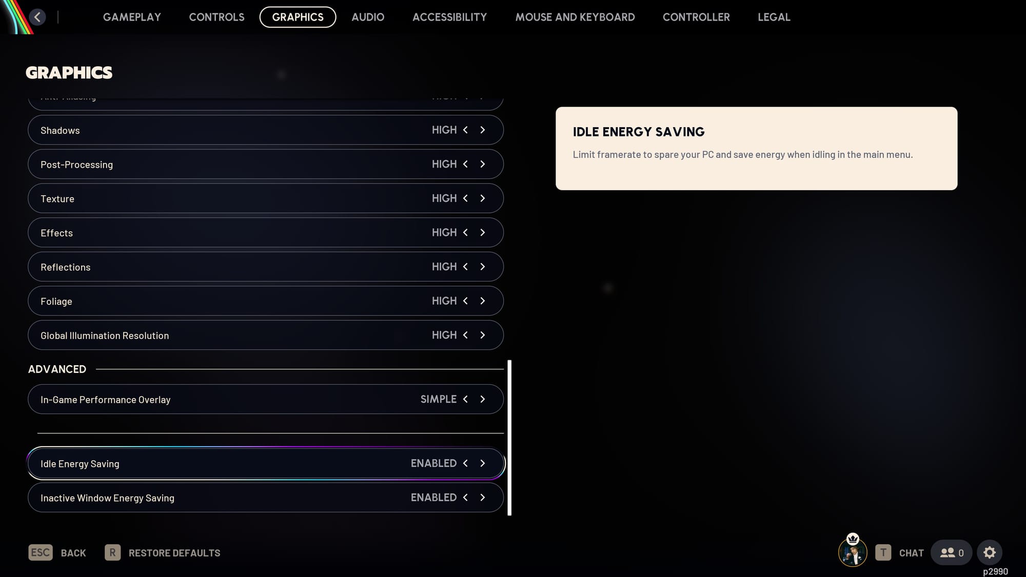 Unfortunately, at present, I think it’s either implemented its settings at too high a level to make a difference for all but a very small portion of players with super high-end PCs, or it's not working as expected. In my testing and over about 60 hours of play, I have not once come back to a menu screen in a visible eco mode state, with the Steam FPS counter never dipping below 59 after long stretches of idling. Here’s two screenshots of the game on menu screens from about 5 minutes of dedicated idling in menus, neither seemed to have low FPS (according to the Steam FPS counter – not captured in the screenshots, you'll just have to trust me), and it's the same basically anytime I'm on a menu screen whether I'm active or not. I know that the render resolution scaling is meant to be dynamic and almost imperceptible, but I would expect at least some change if it's working and I haven't seen any.