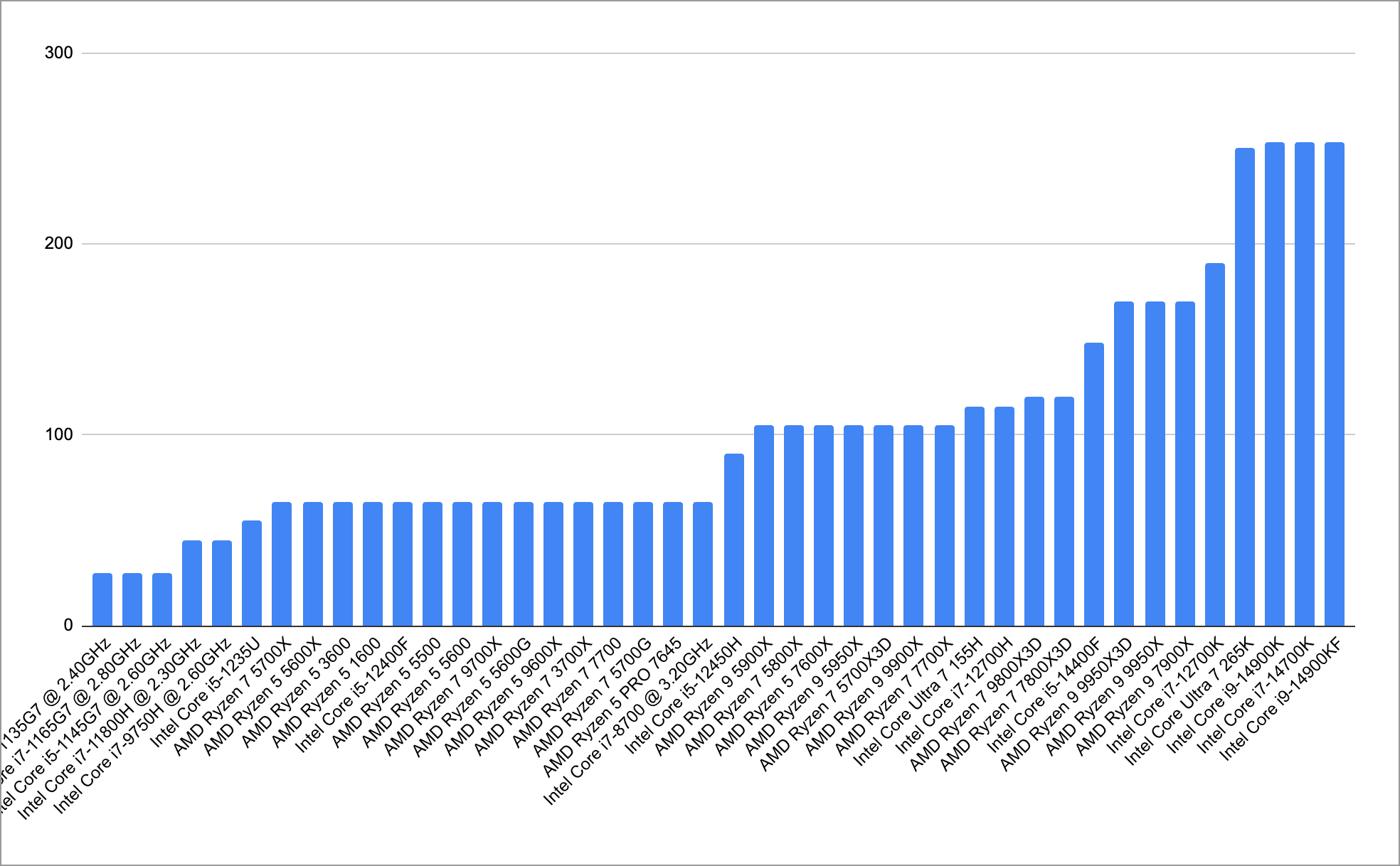 Lots of 65 Watt CPUs (about 15% of the Steam sample), some 120-Watt CPUs (about 8%), and then the remainder up to 250 Watts (making up just 5% of the Steam survey).