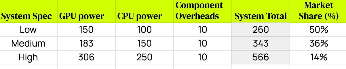 Lastly, I added the CPU and GPU figures together and added a small amount of extra overhead – about 10% – for the other system components, like RAM, the motherboard, storage, etc. The key concern for our purposes now is how popular each particular bucket of low/medium/high spec device is.