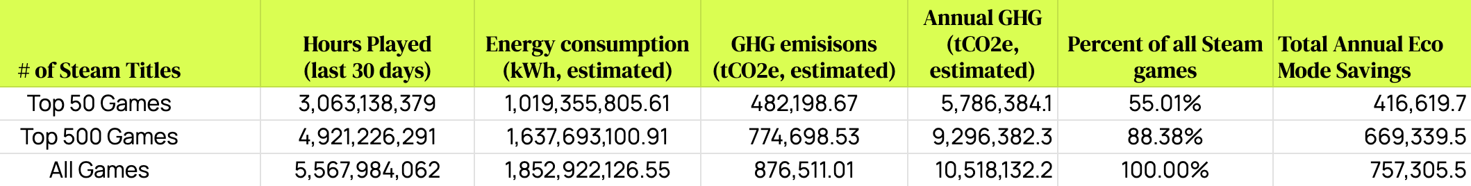 TL;DR – All of Steam players over the past 30 days played for about 5.5 billion hours and consumed (in my estimation) around 1.85 Terrawatt hours of electricity. That amount of power may have emitted as much as 876,000 tCO2e. If we multiply that by 12 to give us an annual estimate, that’s 10.5 million tCO2e per annum from Steam games.