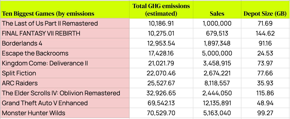 The total from all 600+ games is about 433,000 tonnes of CO2e, which is substantial, and I think supports my position that digital downloads should be measured, disclosed and reduced by game makers.