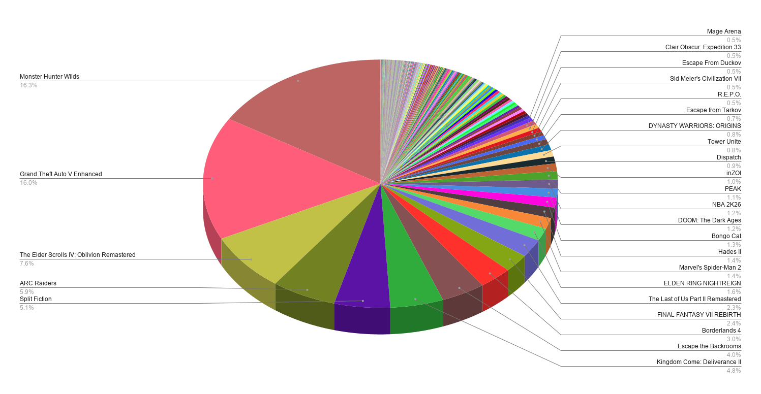 The top 10 games account for about 2/3rds of the total emissions from Steam downloads in 2025, and the number 1 and 2 games – Monster Hunter Wilds (70,000 tonnes of CO2e) and GTA V: Enhanced (69,500 tonnes of CO2e) are alone about 1/3rd of the total. Now, GTA V Enhanced was given out to all existing owners as a free game, so probably it doesn’t represent all real downloads – but how many are is anyone’s guess.